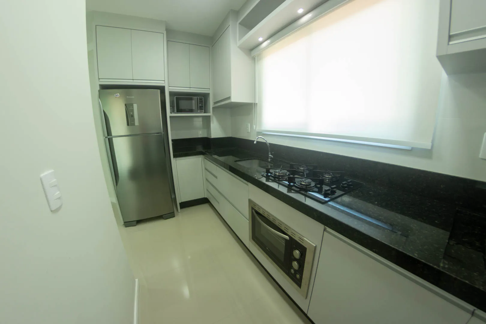 Cozinha equipada com geladeira duplex, microondas, fogão de 04 bocas, forno elétrico e utensílios básicos de cozinha.