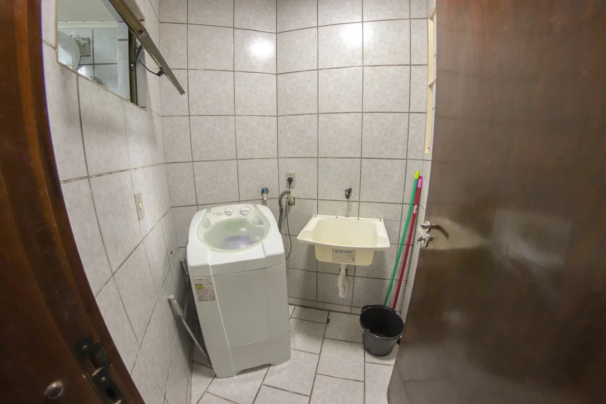 Área de serviço com máquina de lavar roupas e tanque manual.