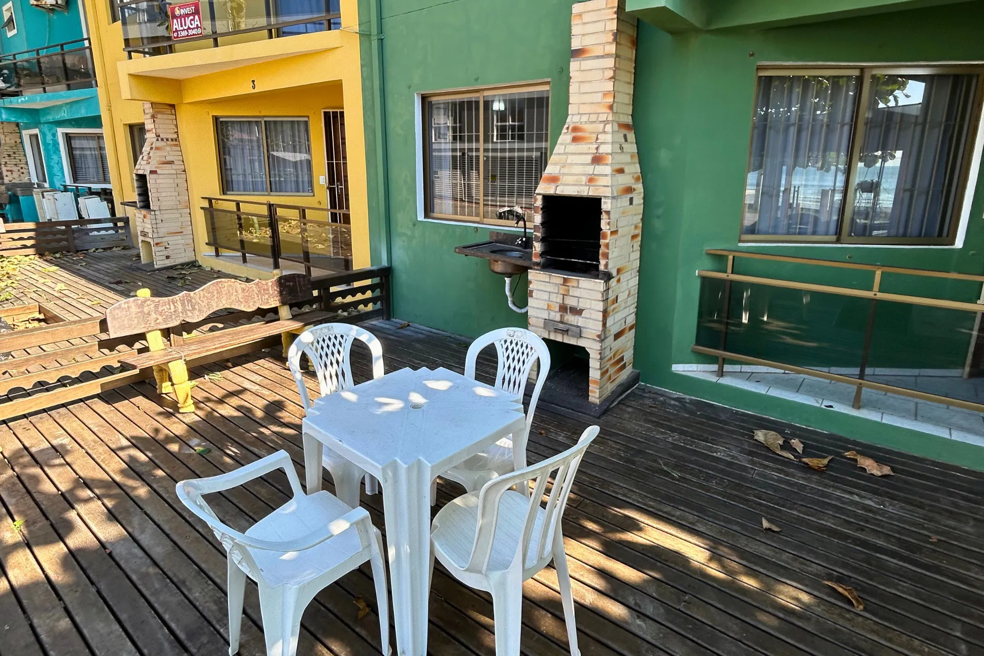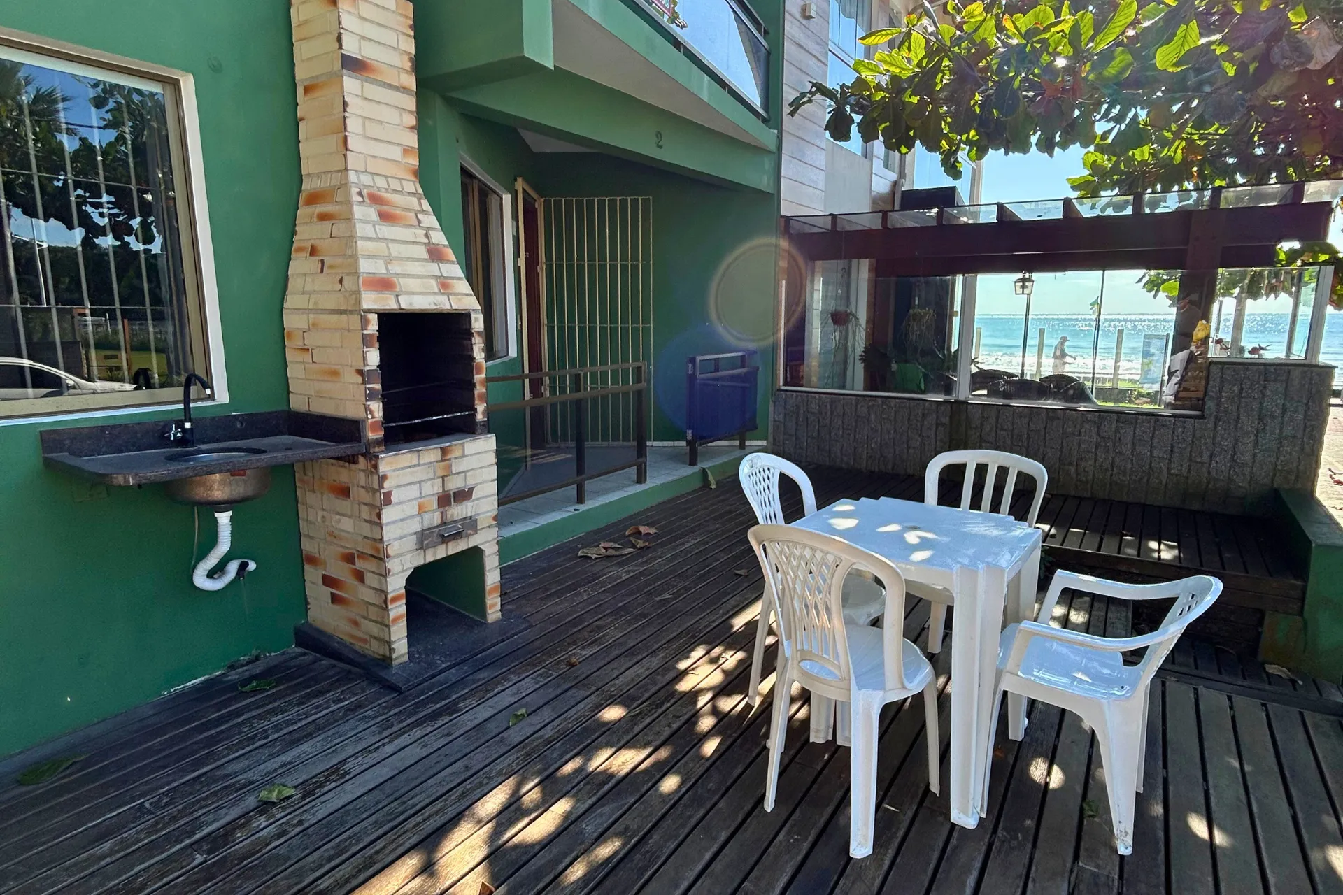 Deck com churrasqueira, pia, banco de 03 lugares e vista para o mar.