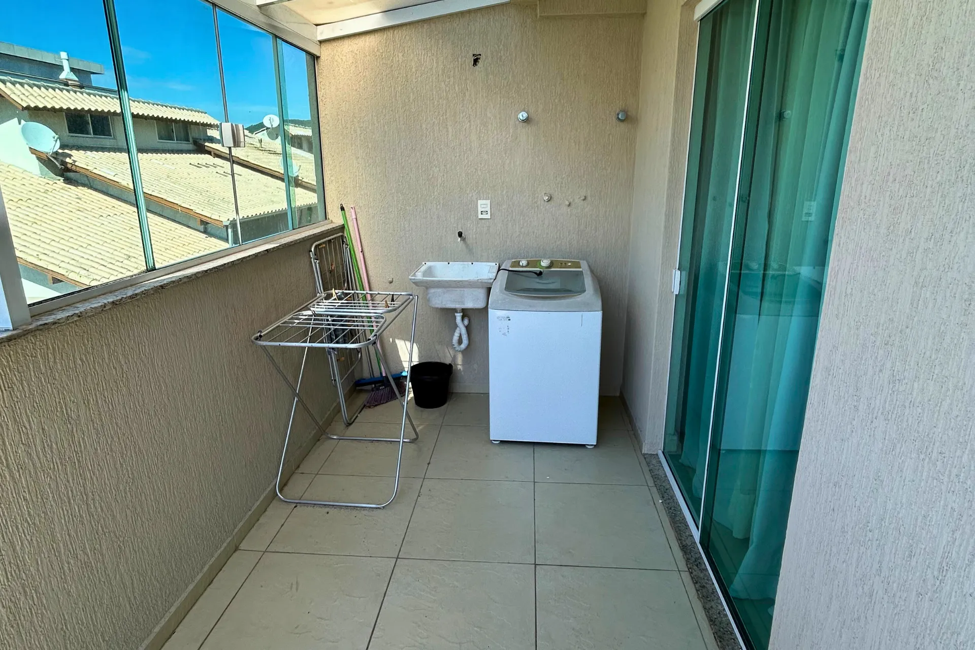 Ampla área externa com churrasqueira, pia, mesa de plástico com 04 cadeiras, máquina de lavar roupas e tanque manual.