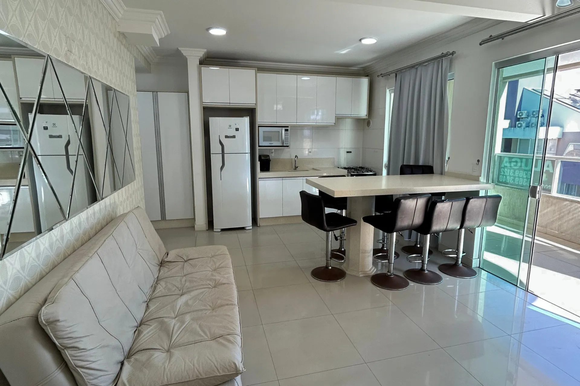 Cozinha equipada com geladeira duplex, fogão de 04 bocas com forno a gás, microondas e utensílios básicos de cozinha. Contém acesso para área externa.